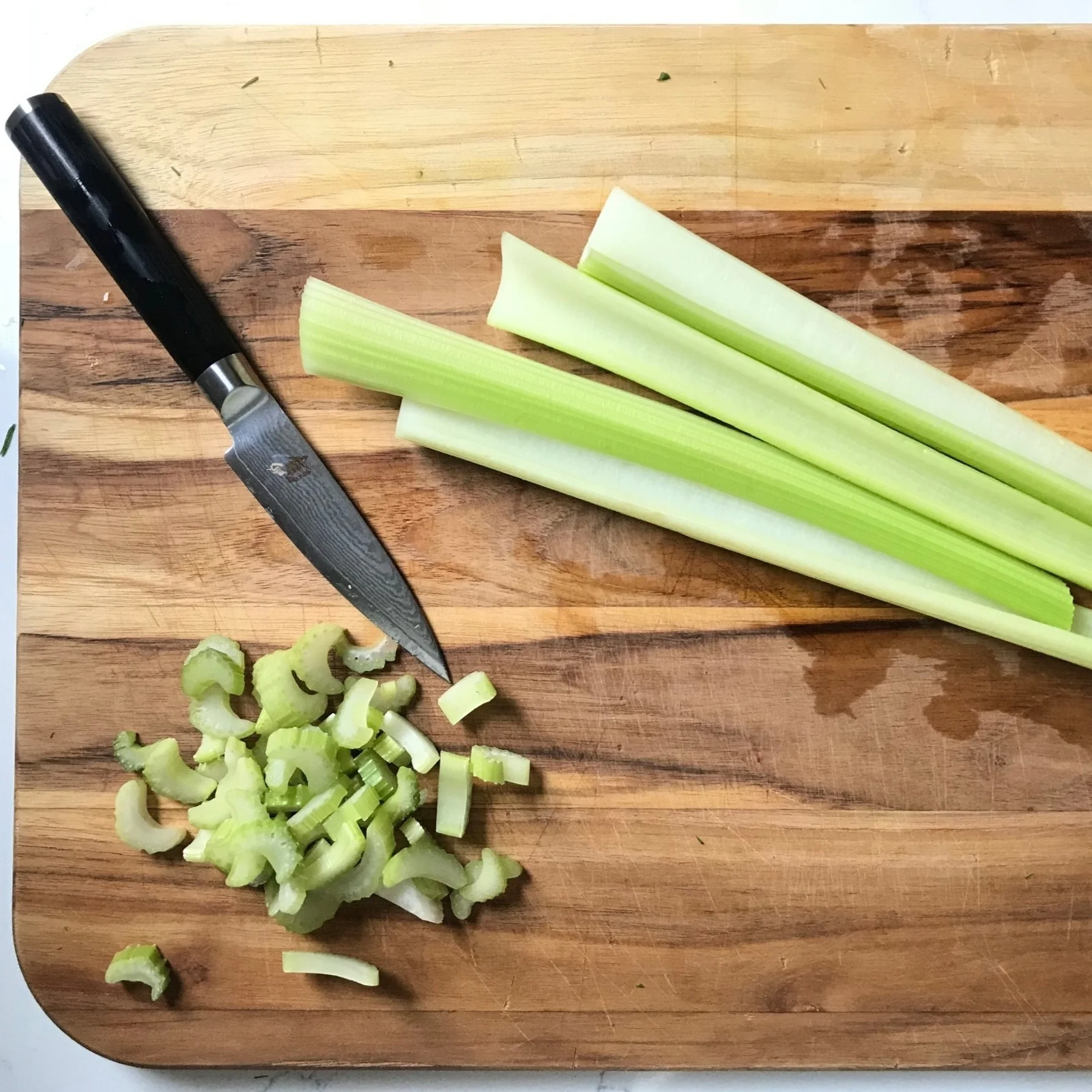 Wash and chop the celery into 1/4 inch pieces. Dice the red onion aiming for 1/4 inch pieces there as well.